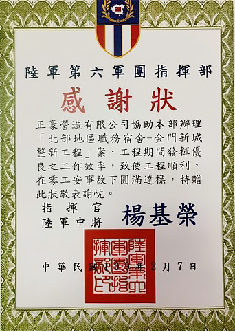 正豪營造承攬之陸軍第六團指揮部「北部地區職務宿舍-金門新城整新工程」,協助完成自來水、電氣業管機關管線圖面送審及契約外工程施工,修改200戶宿舍符合現行法規,以利完成水電申辦,讓軍人及眷屬們能夠順利入住使用,六軍團於109年特頒感謝狀以表謝忱。 中華民國109年02月07日